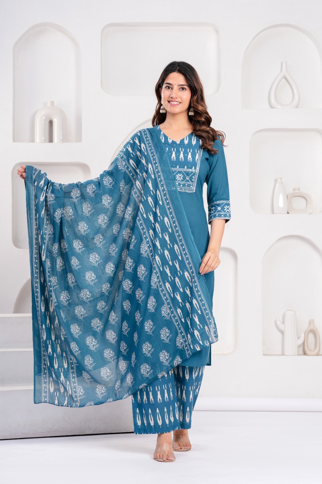 Premium Cotton Three Piece Set on Solid Kurti and Printed Pant, Dupatta